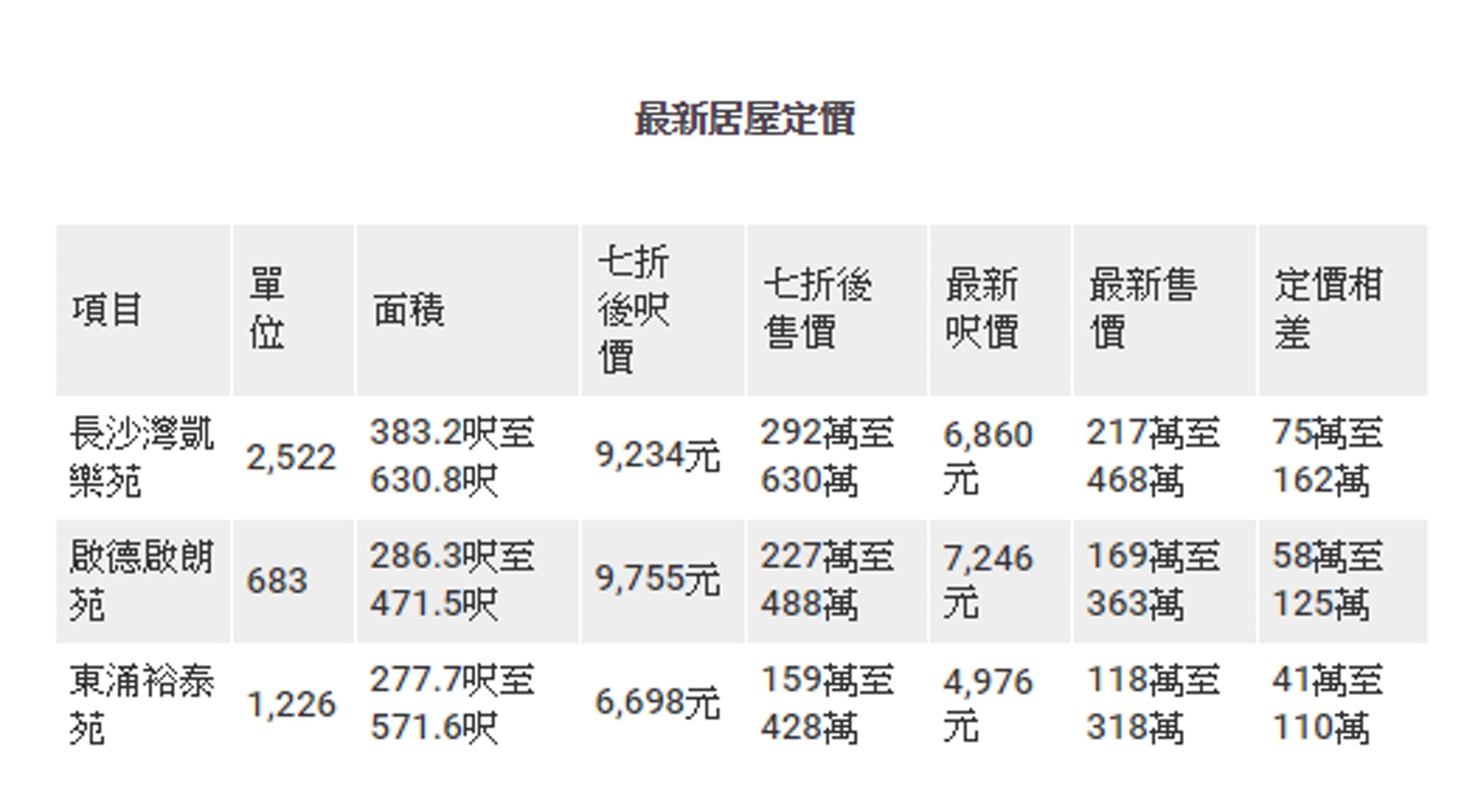 其中東涌裕泰苑,調整後的售價由118萬元至318萬元,呎價為4,976元;長沙灣凱樂苑的售價介乎217萬元至468萬元,呎價為6860元、至於啟德啟朗苑的呎價是三屋苑之冠,達7,246元,售價由169萬元至363萬元不等。